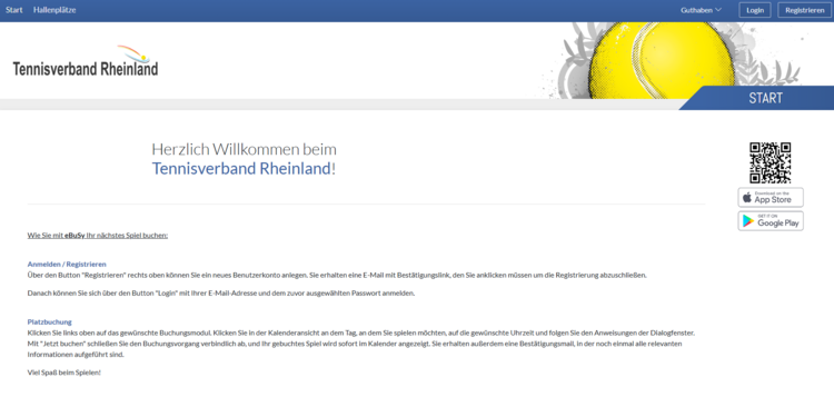 Dafür klicken Sie auf den Button 'Buchung Halle' in der zweiten Zeile auf der Startseite oder benutzen den folgenden Link https://rheinland-tennis.ebusy.de/. Es öffnet sich eine neue Website. Eine Anleitung zur Registrierung und Platzbuchung finden Sie auf der Startseite. Neu ist die Möglichkeit der Buchung von 30 Minuten-Einheiten. Die Zahlung des Platzes erfolgt mit Paypal oder Kreditkarte. Auch der Kauf von 20er-Karten ist über den Button 'Guthaben' möglich.