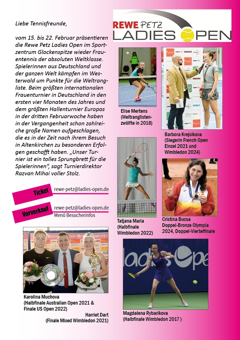 Entnehmen Sie alle Informationen zu dem Internationalen Frauenturnier in Altenkirchen der Website https://rewepetz-ladies-open.de/.