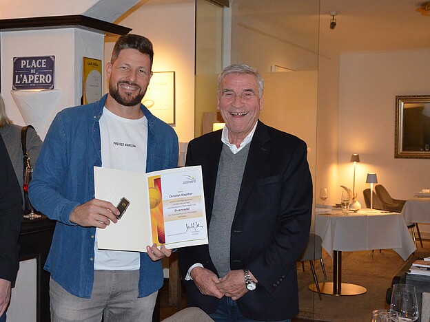 Mit der Auszeichnung bedankt sich TVR-Präsident Ulrich Klaus für das ehrenamtliche Engagement rund um den rheinländischen Tennissport.