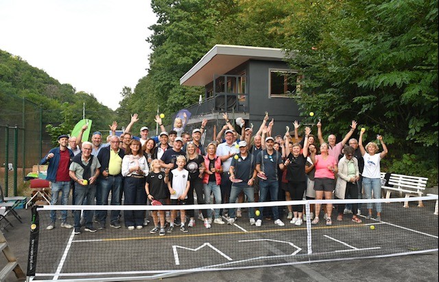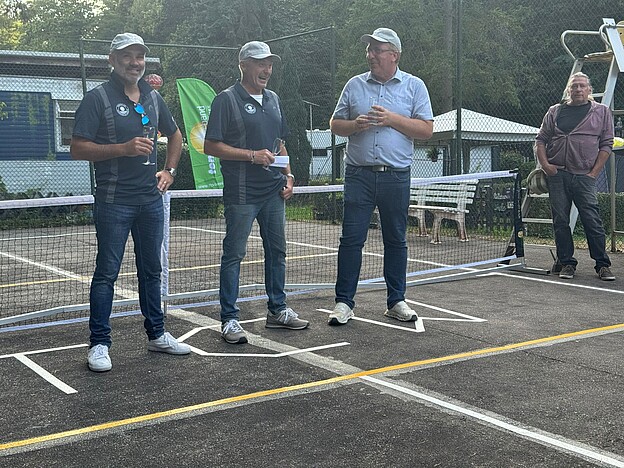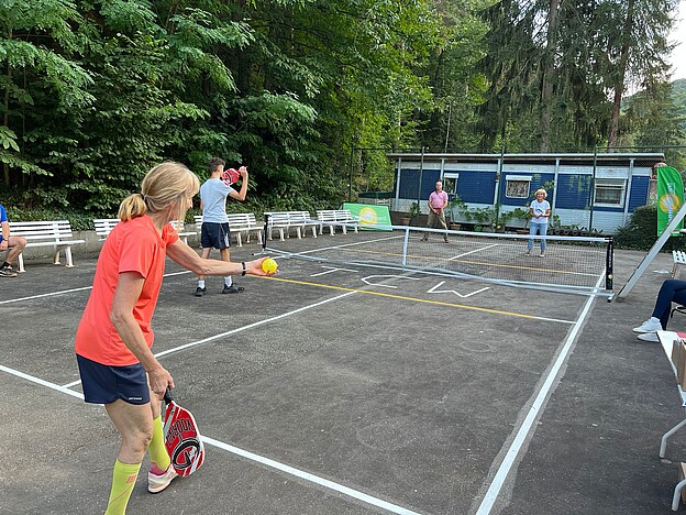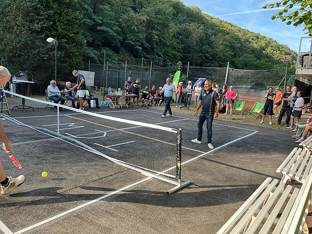 Torsten Bechtel ließ es sich nicht nehmen, die ersten Bälle auf dem Pickleball-Platz zu schlagen, was Spielern und Gästen sehr viel Spaß machte.